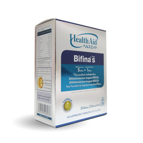 Health Aid Bifina is a probiotic supplement that contains live probiotic strains (Bifidobacterium Longum BB536). Bifidobacterium Longum has been known to improve gut flora, increase immunity and metabolism, and improve digestion / bowel movement.